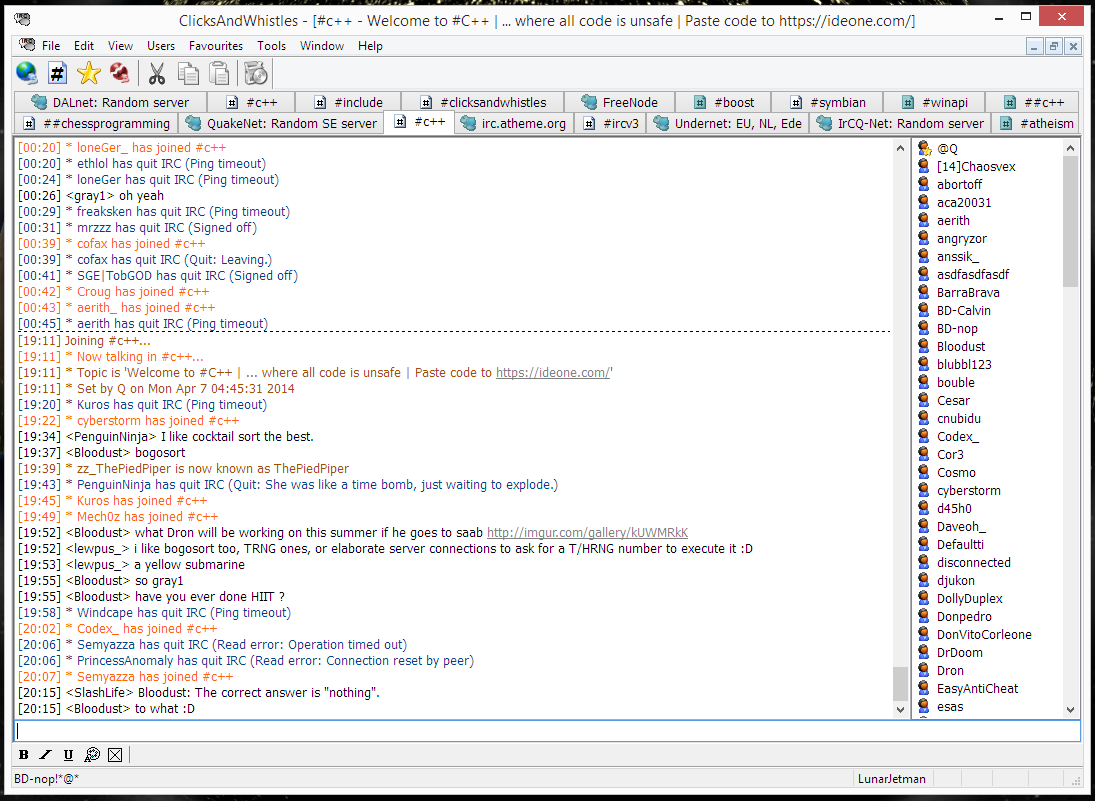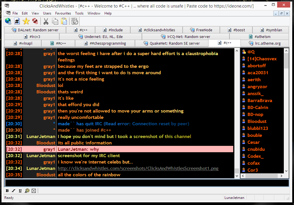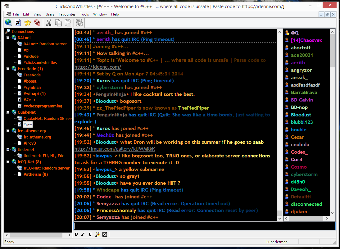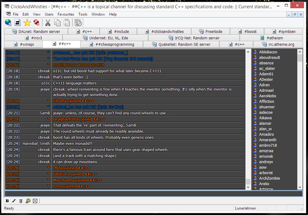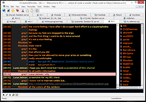 ClicksAndWhistles is a free IRC client for Windows. Internet Relay Chat (IRC) is a form of real-time Internet text messaging allowing you to communicate with others in IRC channels (chat rooms) and one-to-one communication via private messages. You can also connect directly with another user to chat or send/receive files. There are hundreds of IRC networks and thousands of IRC servers providing channels covering a wide variety of topics; you can even start your own channel with little or no fuss. Websites such as Search IRC and irc.netsplit.de let you search for channels on specific topics. Download the latest version of ClicksAndWhistles today and begin chatting, lurking or whatever you freaks do! :) |